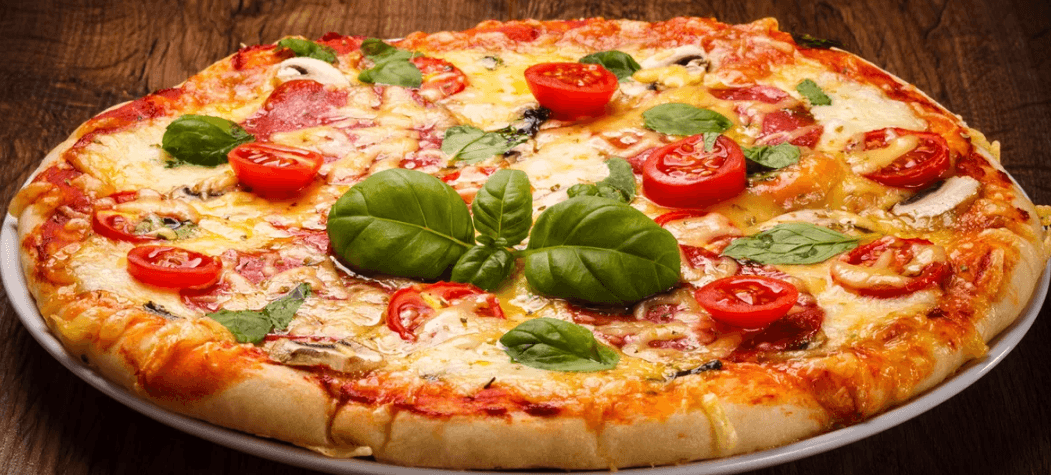 - Šunkovo-žampionová (drcená rajčata, mozzarella, šunka, žampiony, oregano)