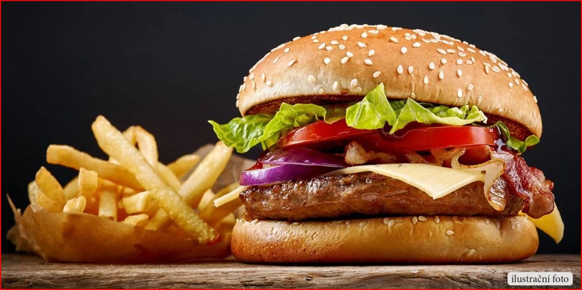 - Složení burgeru: hamburgerová houska, 200 g mletého masa, slanina, kečup + majonéza, zelenina (salát, rajče, okurka, cibule).