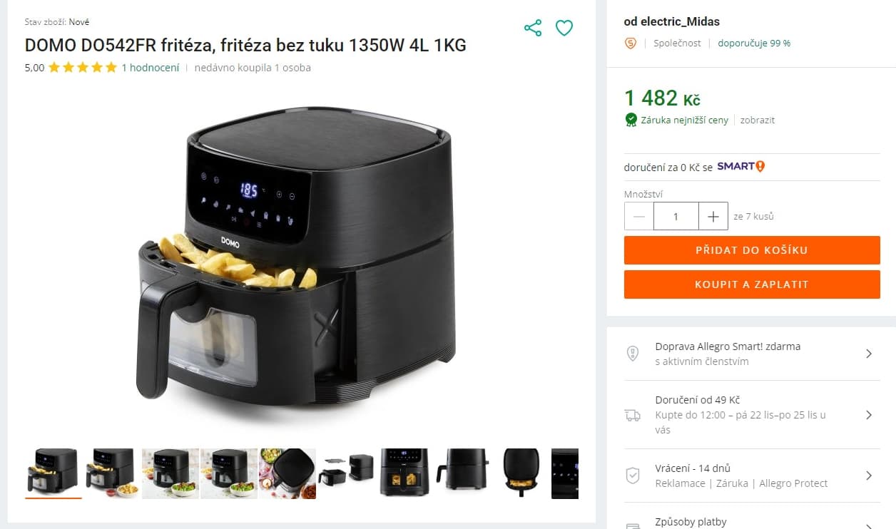 V Black Friday eshopu Allegro se nám líbí horkovzdušná fritéza DOMO DO542FR za 1482 Kč. Standardní cena je okolo 2100 Kč a vy tak ušetříte cca 30%. Na cenové srovnání se podívejte zde.