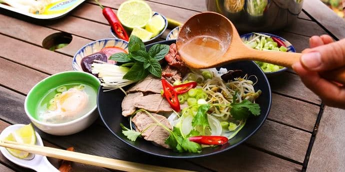 - Bun cha (grilovaný marinovaný vepřový bůček s nudlemi, bylinkami a zálivkou)