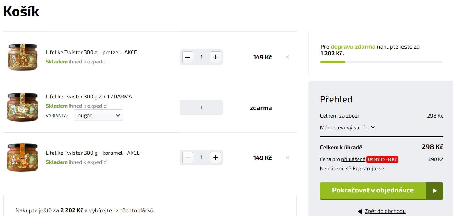 Akce je automatická. Do nákupního košíku stačí vložit dva vybrané kusy a nabídne se vám volba produktu zdarma. S ohledem na to, že nugát je z těchto třech nejdražší, tak ho doporučujeme vybrat právě jako třetí kousek zdarma.