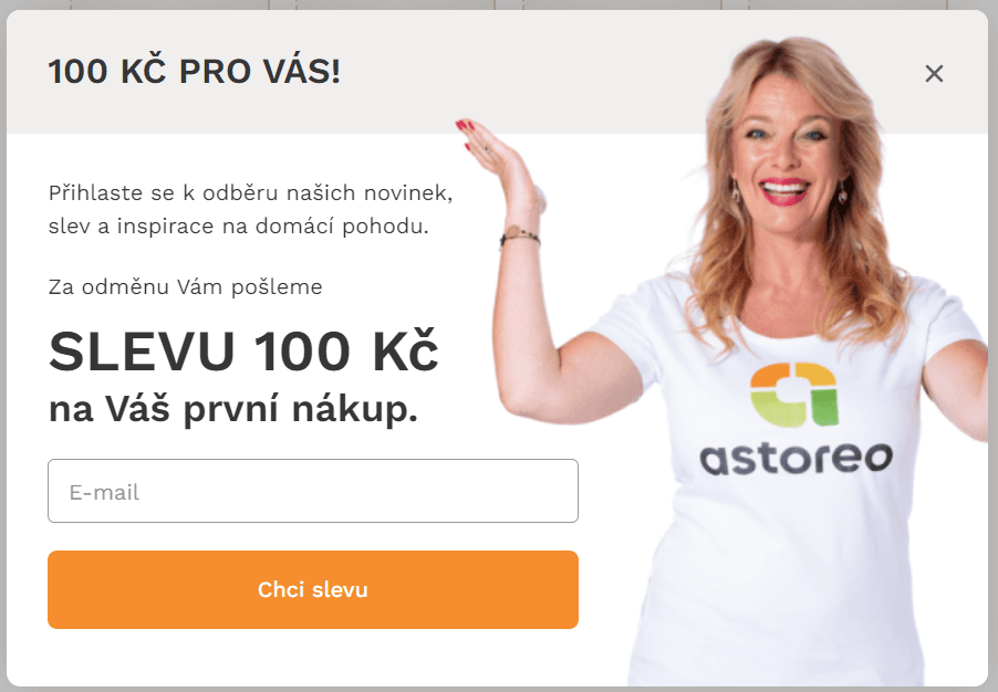 Slevový kód do eshopu Astoreo, který vám zlevní nákup nad 1000 korun o 100 Kč. Pro tuto slevu klikněte na Získej kód a přes vyskakovací okno na hlavní stránce prodejce se přihlaste k odběru jejich newsletteru. Obratem získáte svůj osobní slevový kupón.